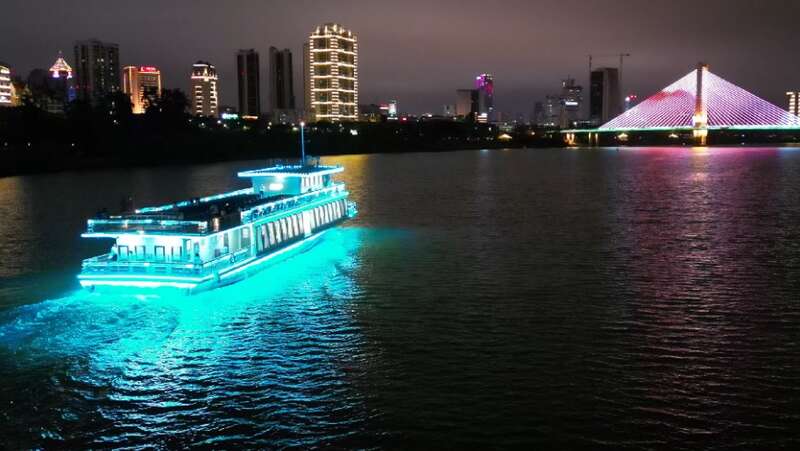 沿邕江而行,夜游项目串联起畅游阁、冬泳亭、古城墙等八大文化地标。近年来,南宁投入超220亿元实施邕江综合整治,建成“江畅、水清、岸绿、景美”的滨水空间。游船缓缓驶过民生码头,两岸光影与城市天际线交相辉映,粤语戏腔吟唱的《南宁谣》在江面回荡。