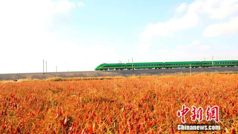 列车驶过新疆焉耆县辣椒地。杨志荣 摄