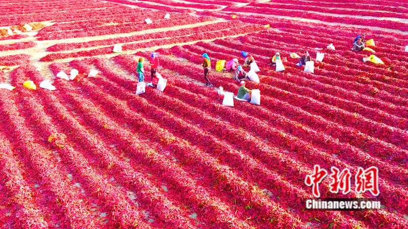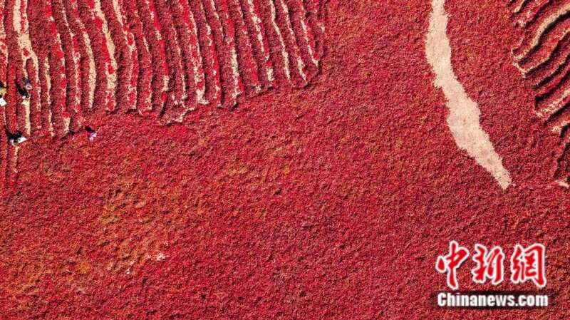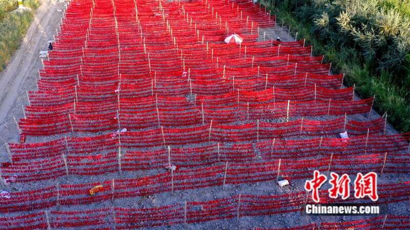 航拍焉耆县焉耆镇农民晾晒红辣皮子。杨志荣 摄