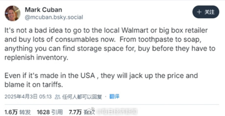 库班写道:“从牙膏到肥皂,凡是能找到地方可以储存的东西,都应该趁早买起来,最好是在商店补货前购买。”库班强调, 即使是美国货,也有可能涨价,“他们会甩锅给关税”。