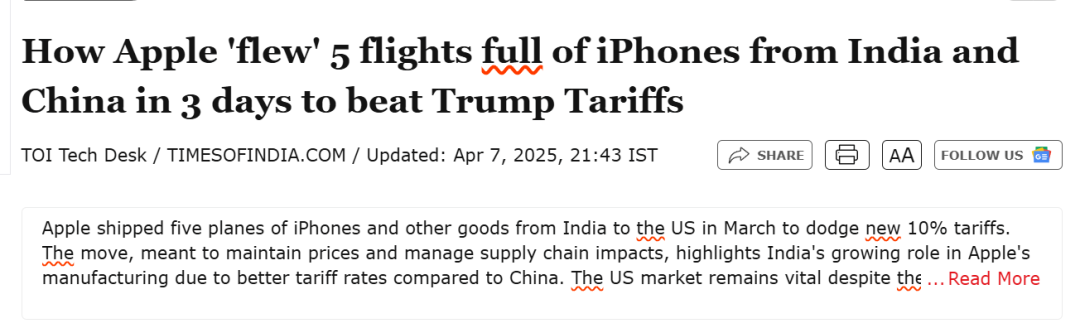 最新的关税冲击将是苹果公司迄今面临的最大考验。据《印度时报》报道,为了应对美国新征收关税的影响,苹果公司迅速采取行动,在 3 月的最后一周仅用三天时间就从印度向美国运送了五架飞机的 iPhone 和其他产品。