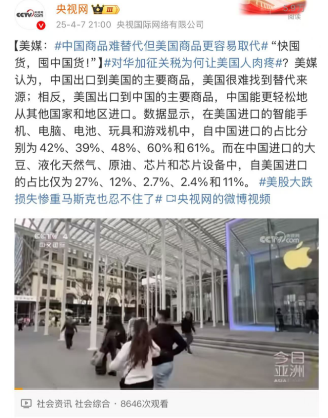 美媒认为,中国出口到美国的主要商品,美国很难找到替代来源;相反,美国出口到中国的主要商品,中国能更轻松地从其他国家和地区进口。