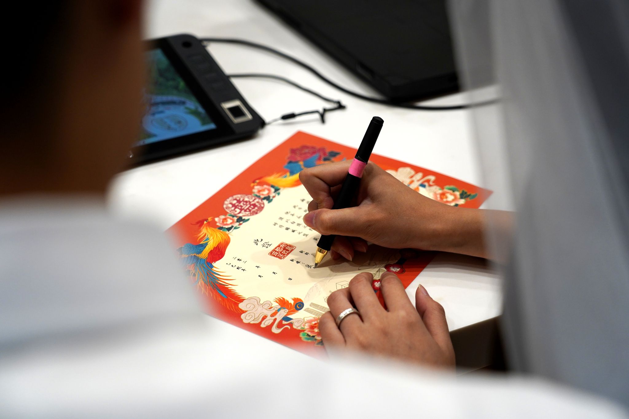 2025年4月9日,四川成都一对新人在定制婚书上签上自己的名字。4月起,在四川省成都市各婚姻登记处领证的新人,都能免费获赠一份定制版婚书。这份婚书整体采用传统复古绘画风格,设计元素融入了传唱千年的《凤求凰》,为婚书增添古韵,也为结婚登记增添了仪式感。 中新社记者 吕杨 摄