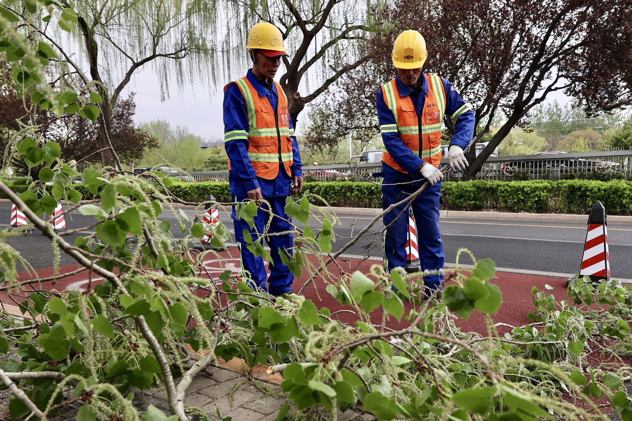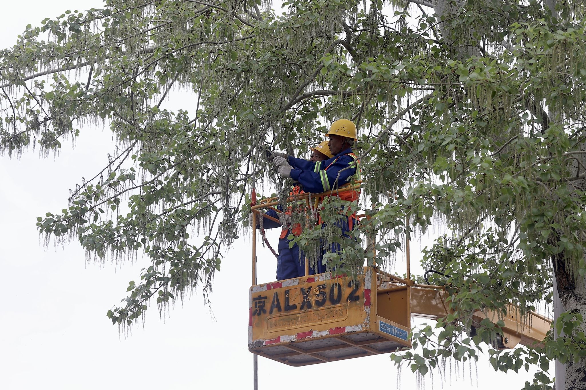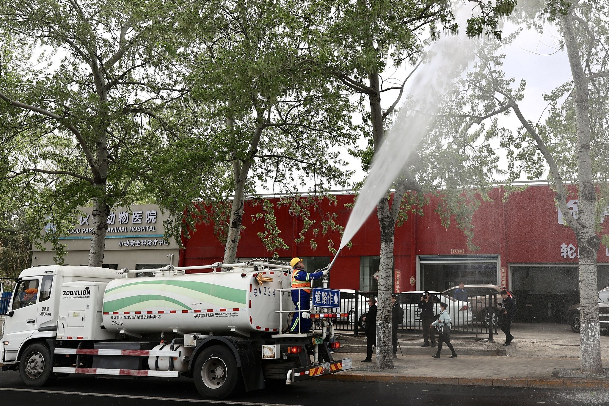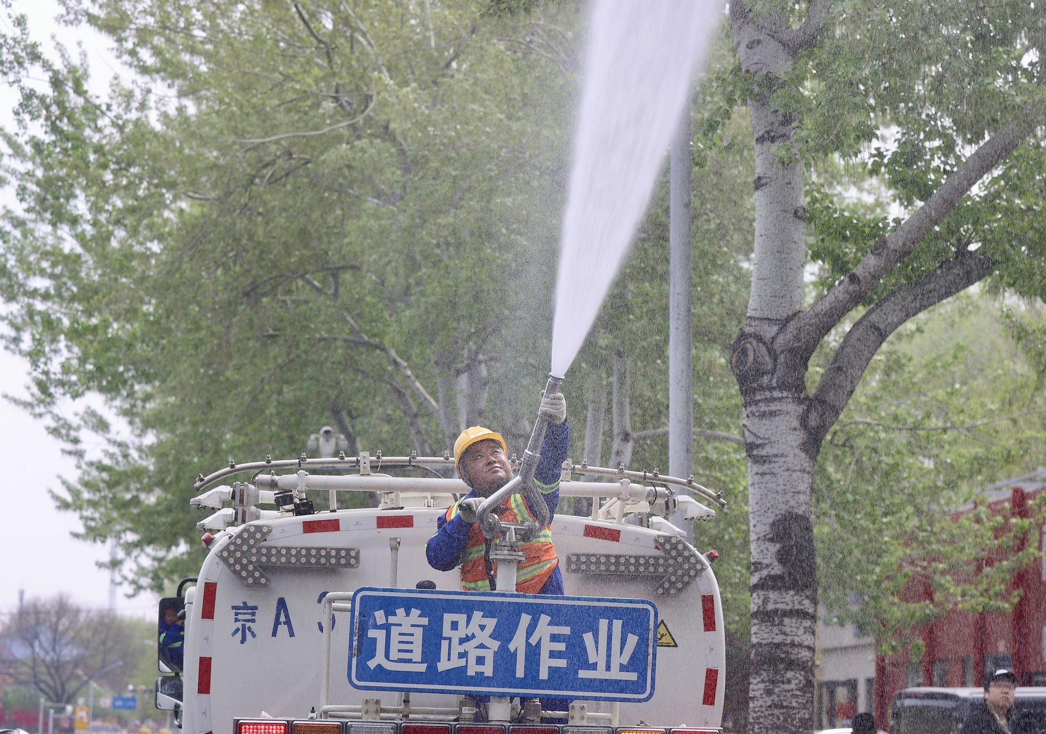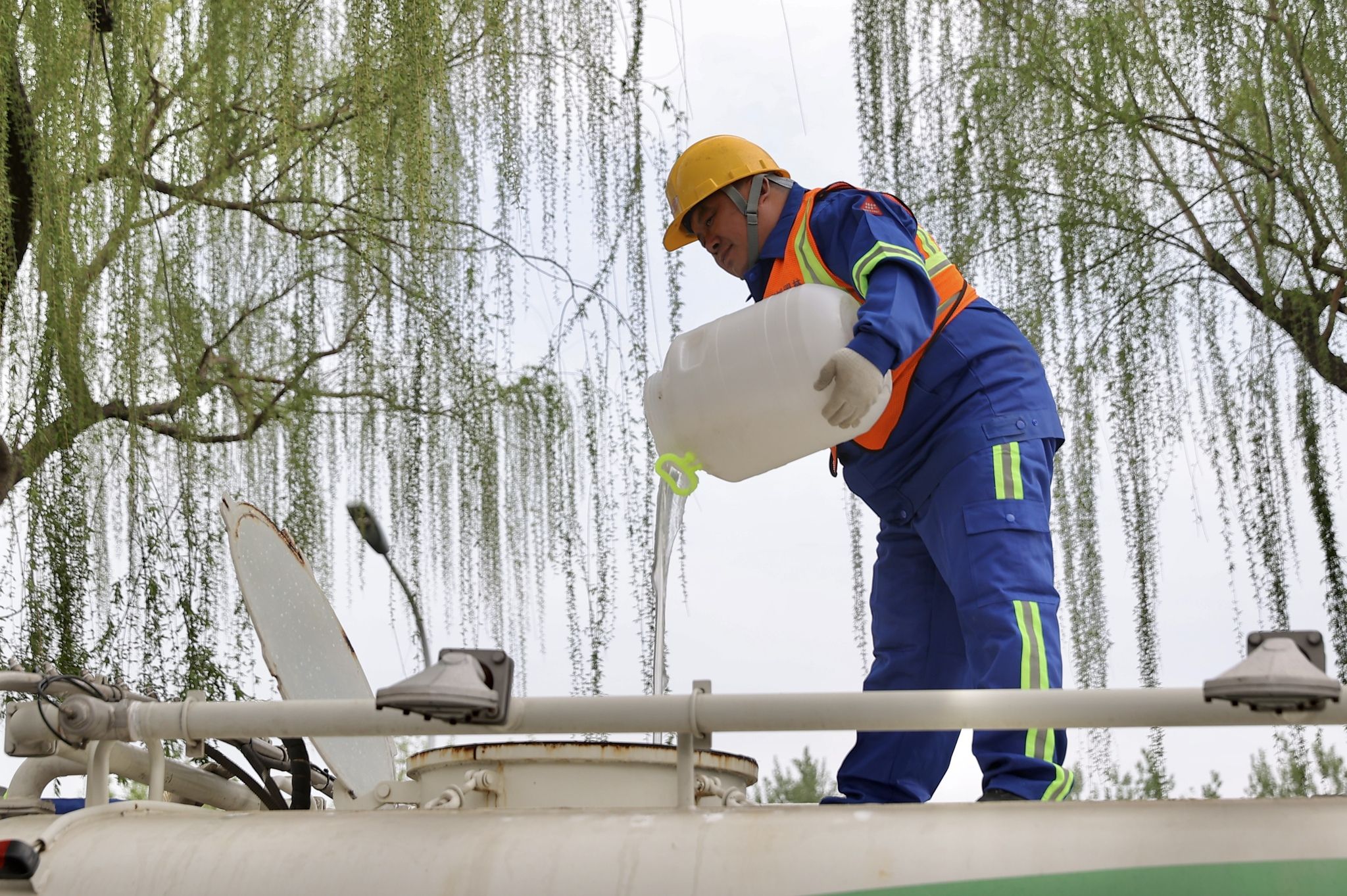 2025年4月9日,在北京市东城区永定门东滨河路,园林工人进行杨柳飞絮治理。据北京市园林绿化局介绍,北京自4月4日进入今年杨柳飞絮始发期,全市将采取多种措施开展精准治理,降低飞絮对市民生活的影响。根据预测预报,北京在4月上旬进入第一个飞絮高发期。图为园林工人向水车内灌注凝絮剂。这种凝絮剂经水份稀释后结合高压水枪、雾炮车、无人机可均匀喷洒于树冠之上,使杨柳絮在树上粘结、收缩,失去飞行能力,进而减少飞絮危害,起到物理防治效果。而且凝絮剂为无毒无害、环境友好型高分子有机物,在后期经过雨水和光照可自然降解。 中新社记者 易海菲 摄