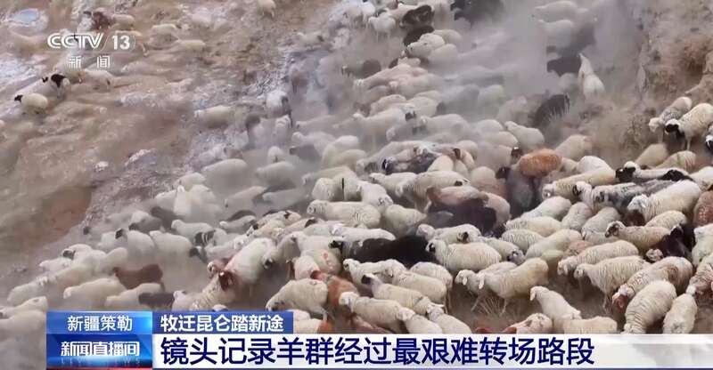 首先,牧民和羊群穿过了必经的山谷,这里是转场中自然灾害相对频发的区域,要快速通过,小心落石滚下。