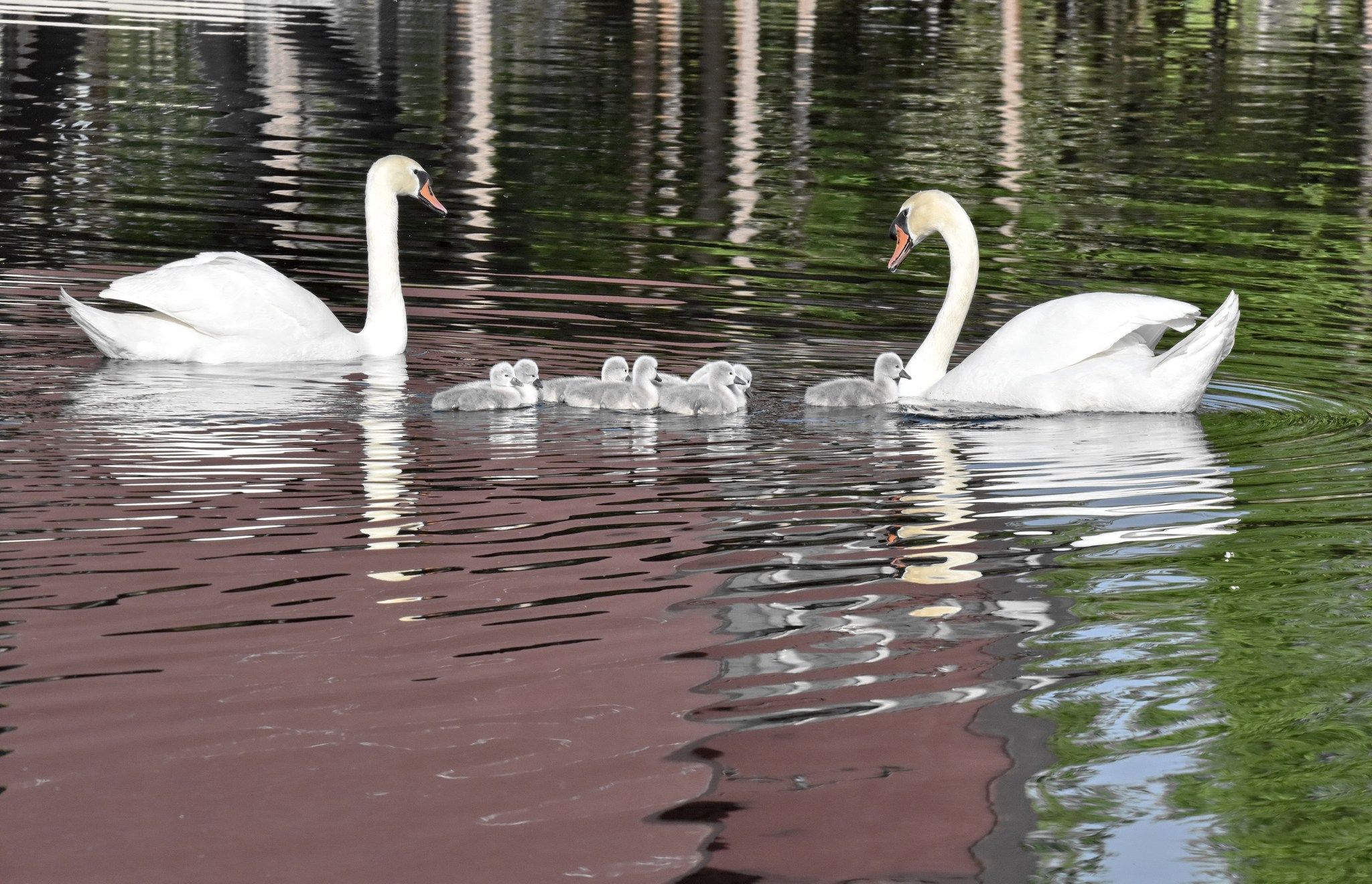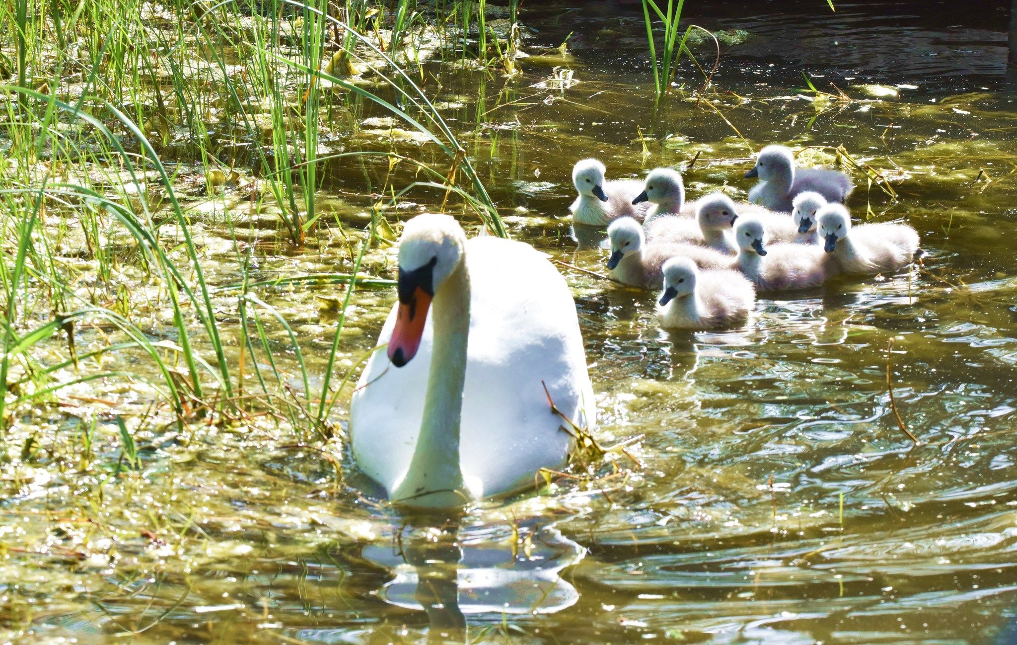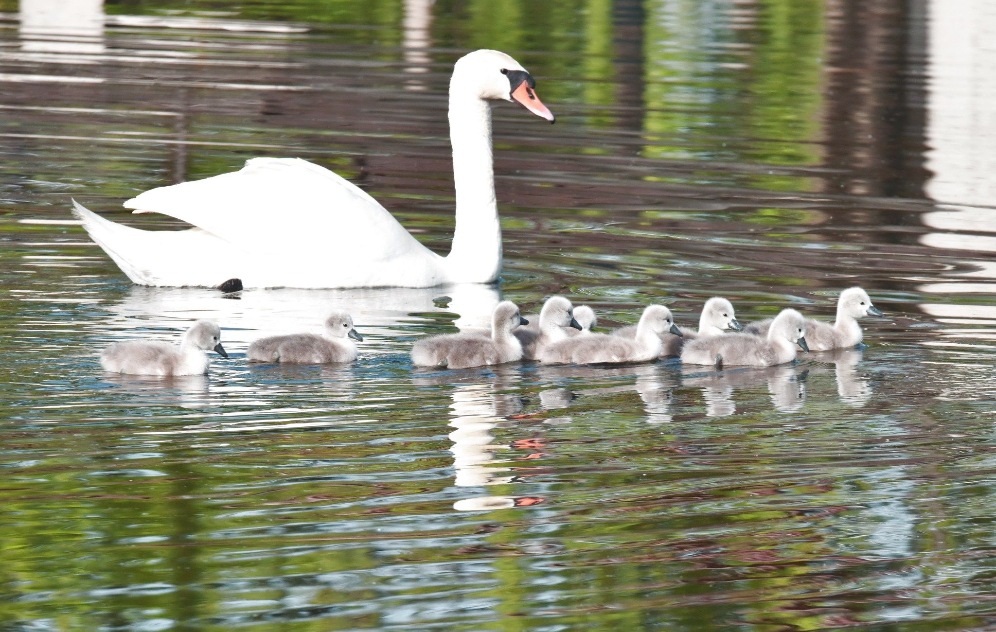 2025年4月13日,河南郑州,北龙湖湿地公园疣鼻天鹅,“王子”和“公主”夫妻喜讯再传,经过30多天辛苦抱窝孵化,9只小天鹅宝宝在父母呵护和带领下,开始下水觅食。