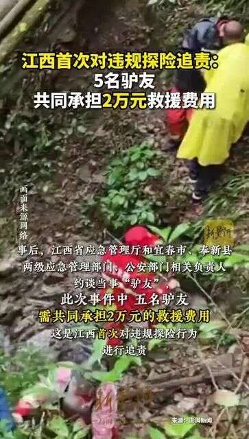 比如就在前两天,江西省有关部门对3月2日前往庐山西海丛林中走失的六名徒步探险人员追缴救援费用20000元,并对组织者邓某某追缴救援费用4000元。据悉,这也是江西首次由政府对野游活动组织者进行追偿。
