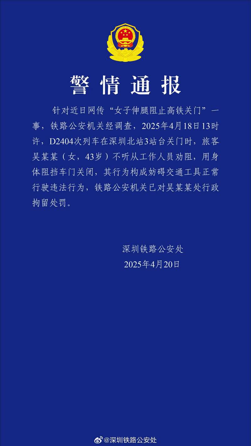 记者从深圳铁路公安处获悉,近日,一名旅客在深圳北站强行阻挡列车车门关闭,构成妨碍交通工具正常行驶违法行为,已被铁路公安机关行政拘留。