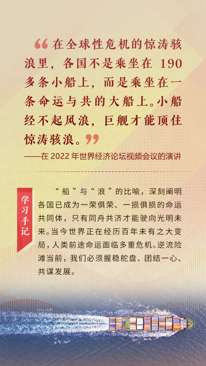 “天空足够大,地球足够大,世界也足够大,容得下各国共同发展繁荣”“你中有我、我中有你的命运共同体”“与中国同行就是与机遇同行”……习近平总书记一次次在重要场合发表重要讲话,指引我们站在历史正确的一边,站在人类进步的一边,不畏浮云、登高望远,不惧风浪、勇毅前行。