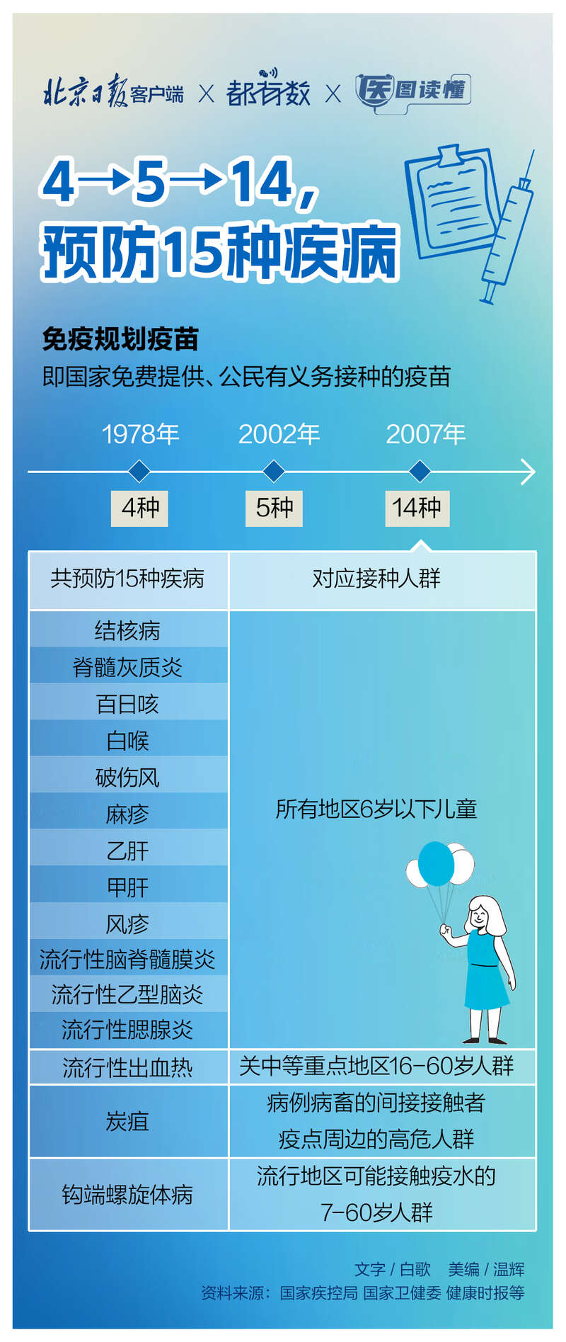 疫苗接种是预防疾病、增进健康最有效和最经济的手段之一。1978年,我国响应世界卫生组织的要求全面实施计划免疫,经过40余年,纳入国家免疫规划(国家免费提供、公民有义务接种)的疫苗从4种逐步扩展到14种。