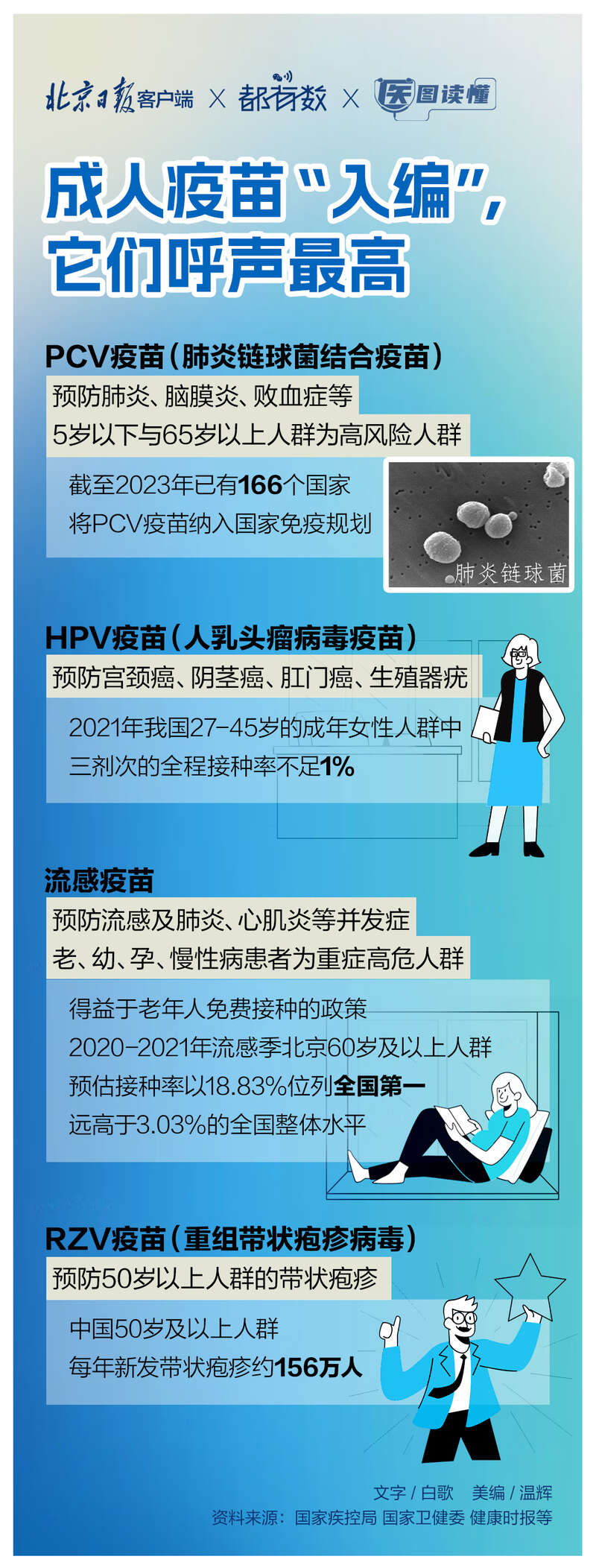 国家疾控局局长沈洪兵介绍,目前世界卫生组织优先推荐所有国家纳入免疫规划的10种疫苗里,中国尚有4种未纳入,其中PCV疫苗(肺炎链球菌结合疫苗)、HPV疫苗(人乳头瘤病毒疫苗)都可覆盖成人。此外流感疫苗、RZV疫苗(重组带状疱疹病毒)“入编”的呼声也很高。
