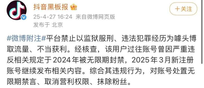 4月27日下午,抖音黑板报官方微博发布声明:“平台禁止以监狱服刑、违法犯罪经历为噱头博取流量、不当获利。经核查,该用户过往账号曾因严重违反相关规定于2024年被无限期封禁,2025年3月新注册账号继续发布相关内容。综合其违规行为,对账号处置无限期禁言、取消营利权限、抹除粉丝。”
