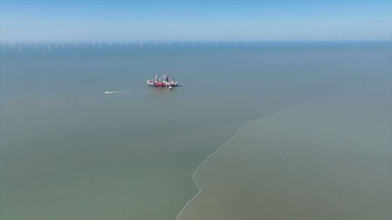 新胜利一号平台位于山东黄河三角洲国家级自然保护区边缘,黄河入海的地方。由于黄河水含沙量大,浑黄的河水裹挟着泥沙,和蓝色的海水相互冲击,形成一条明显的分界线,蓝黄交汇,好似“鸳鸯锅”。