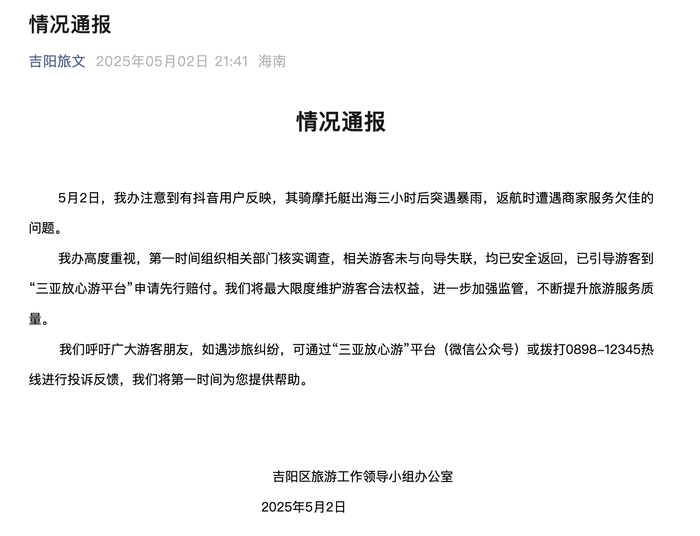三亚市吉阳区通报:游客骑摩托艇出海遇暴雨 已安全返回