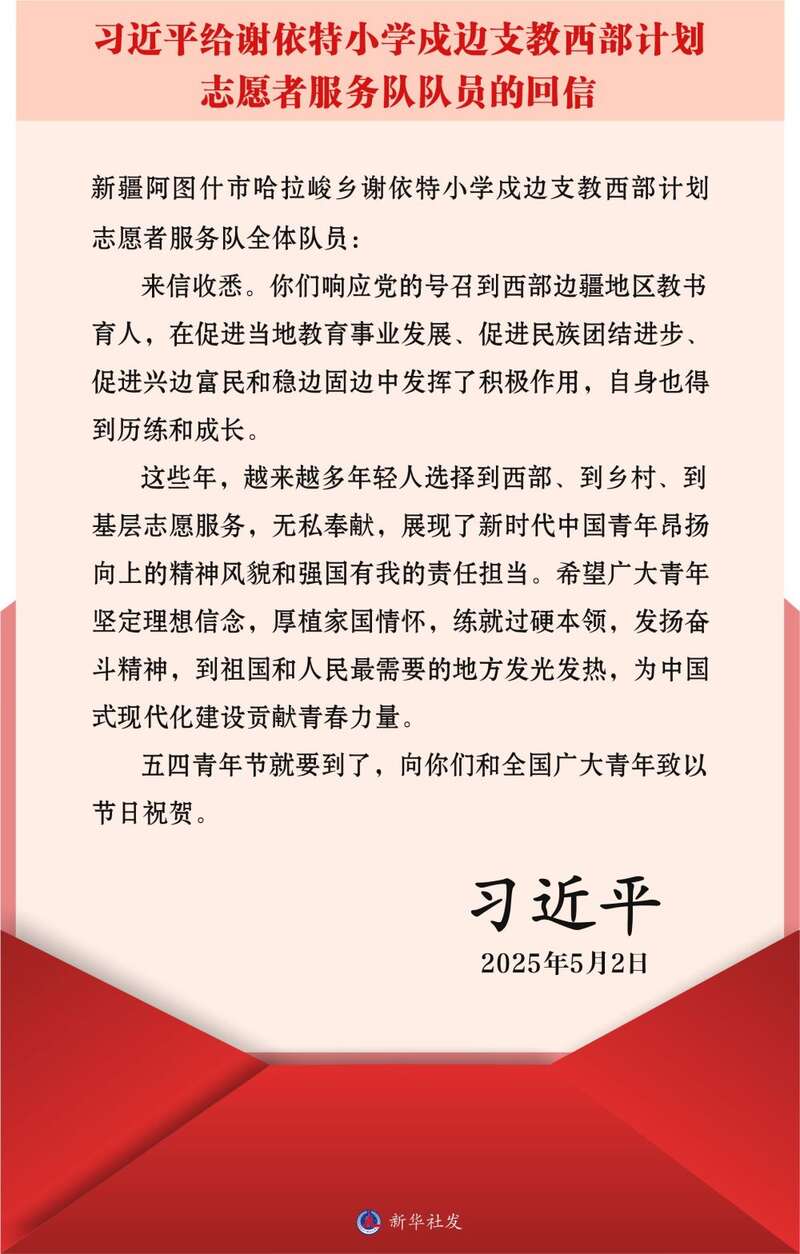近日,谢依特小学戍边支教西部计划志愿者服务队队员给习近平总书记写信,汇报戍边支教的情况和体会,表达扎根西部、服务边疆的决心。总书记回信,对队员们寄予厚望,并勉励广大青年坚定理想信念,厚植家国情怀,练就过硬本领,发扬奋斗精神,到祖国和人民最需要的地方发光发热,为中国式现代化建设贡献青春力量。