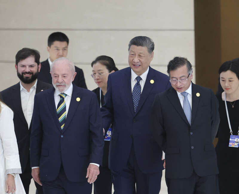 习近平同拉共体轮值主席国哥伦比亚总统佩特罗、巴西总统卢拉、智利总统博里奇、拉美和加勒比国家以及地区组织代表团团长亲切握手并集体合影。