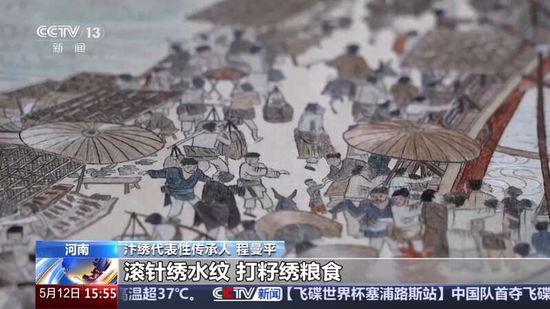 汴绣代表性传承人 程曼平:平针绣人物、蒙针绣水面、滚针绣水纹、打籽绣粮食、反戗绣瓦片……汴绣针法,一般的情况下,你只要专心学习,3年左右就能完全掌握汴绣的针法。但是,最难的是怎样把针法运用到作品里,使这幅作品更立体、更逼真。