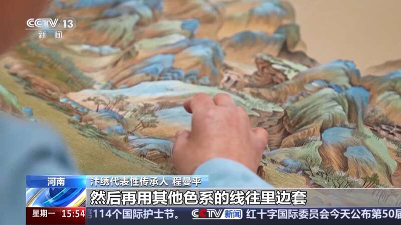 汴绣代表性传承人 程曼平:因为山的颜色有变化,我们采用散套绣。什么叫散套绣? 散套绣就是先用基础色稀稀地做,这就是“散”。然后,再用其他色系的线往里边套。蓝的融进去黄的,山的下边融进古铜色,绣好之后让山的各种颜色充分融合在一起。所以说,我认为散套绣针法是这几十种针法里最难的。