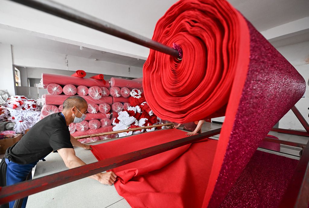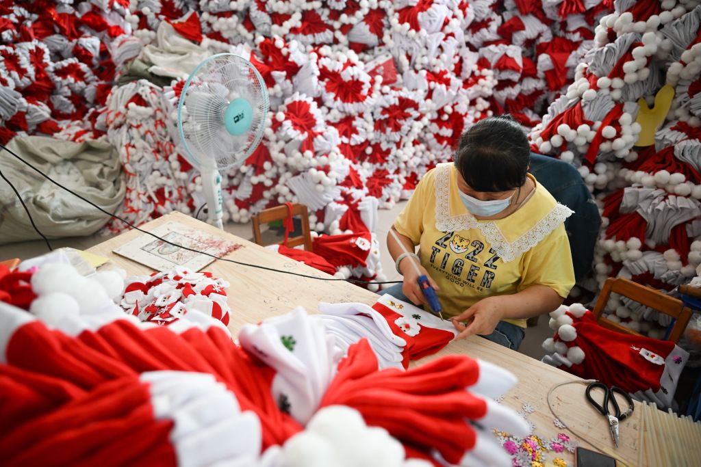 2025年5月15日,浙江义乌,工人忙于生产圣诞帽。近日,在全球圣诞用品集散地——浙江义乌,“圣诞经济”逐步升温,不少商家和企业迎来圣诞装饰用品的生产高峰期,供应来自国际市场的订单需求。据了解,今年一季度义乌进出口总值达1674.5亿元人民币,同比增长13.0%,其中对东盟和欧盟进出口额增长16.1%和16.5%。 中新社记者 王刚 摄