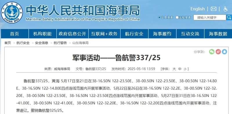 航行警告!黄海部分海域有军事活动