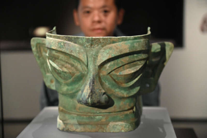 观众在观看三星堆博物馆藏的青铜人面具。中青报·中青网记者 李剑平/摄