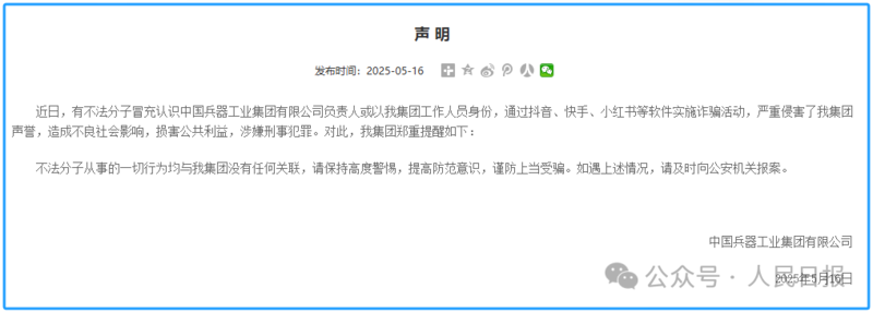 中国兵器工业集团发布声明:近日,有不法分子冒充认识中国兵器工业集团有限公司负责人或以我集团工作人员身份,通过抖音、快手、小红书等软件实施诈骗活动,严重侵害了我集团声誉,造成不良社会影响,损害公共利益,涉嫌刑事犯罪。