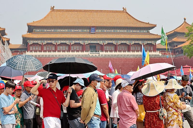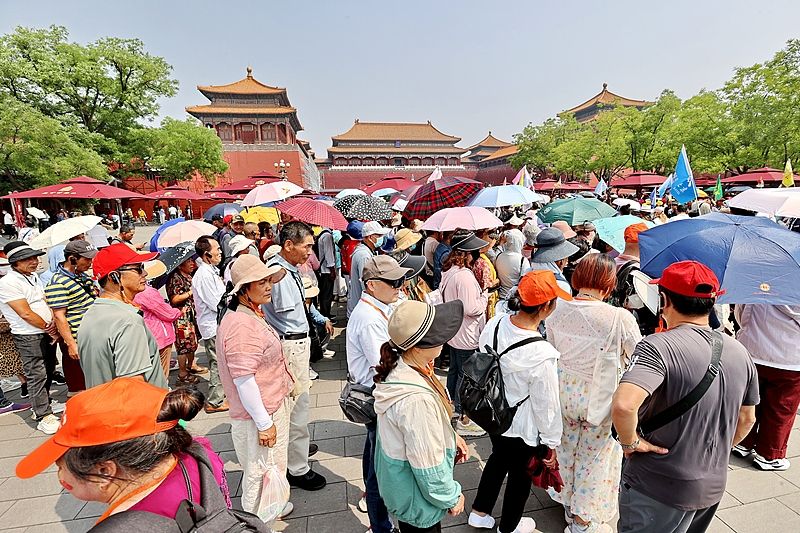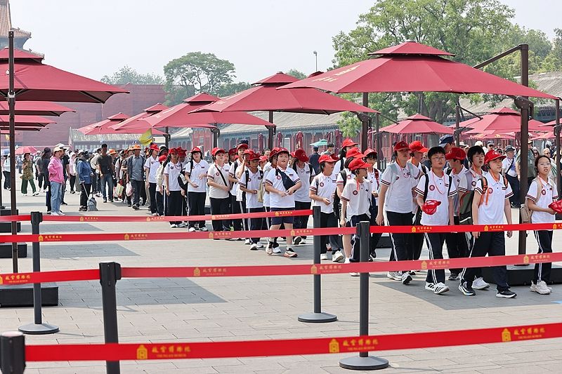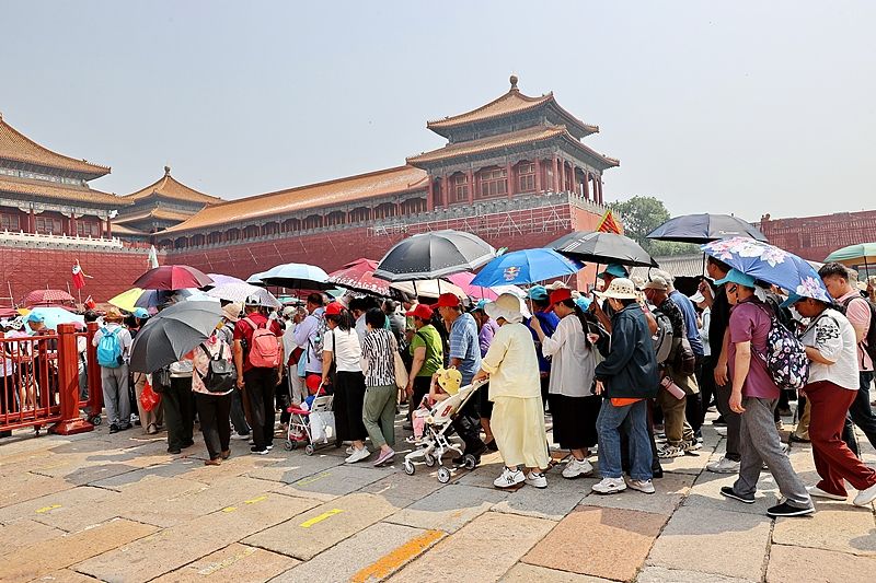 2025年5月20日,北京,游客顶烈日游览故宫博物院,尽管紫外线照射强烈,午后气温达33摄氏度,依然兴致不减。
