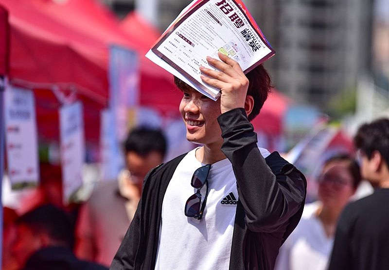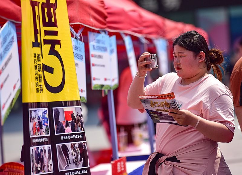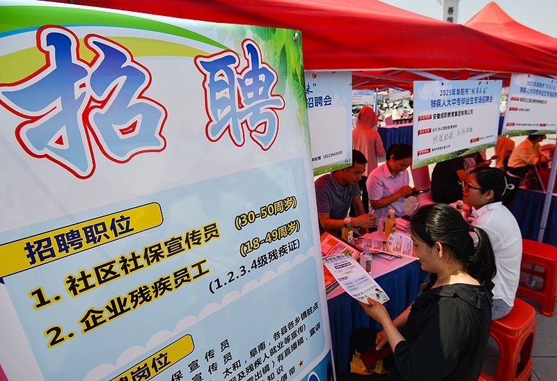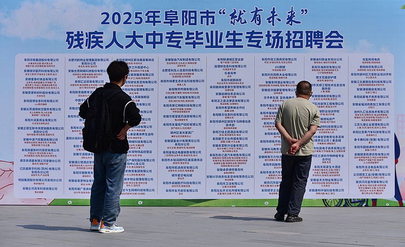 2025年5月21日,安徽阜阳,求职者在招聘会上寻找就业岗位。