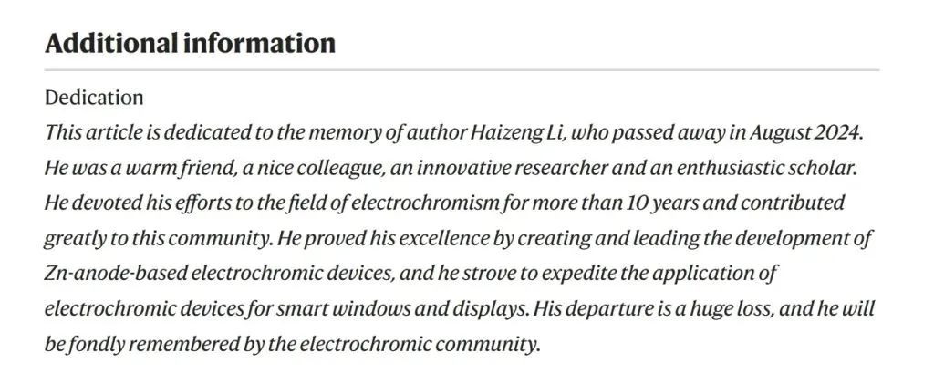 文章的附录部分写道:本文献给2024年8月去世的作者李海增,他是一位热情的朋友、一位好同事、一位富有创新精神的研究人员和一位热情的学者。他通过创建和领导基于锌阳极的电致变色器件的开发证明了自己的卓越成就,并致力于加速电致变色器件在智能窗和显示器上的应用。他的离去是一个巨大的损失,电致变色界将永远怀念他。