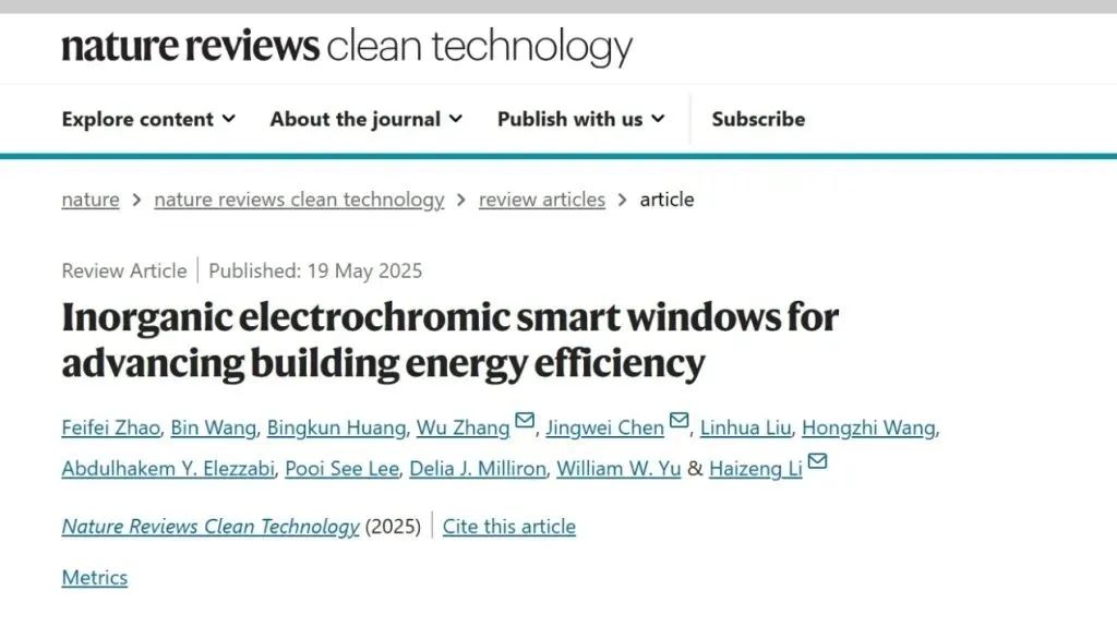 据澎湃新闻消息,5月19日,《Nature Reviews Clean Technology》最新一期刊发了一篇题为 “Inorganic electrochromic smart windows for advancing building energy efficiency” 的综述文章。