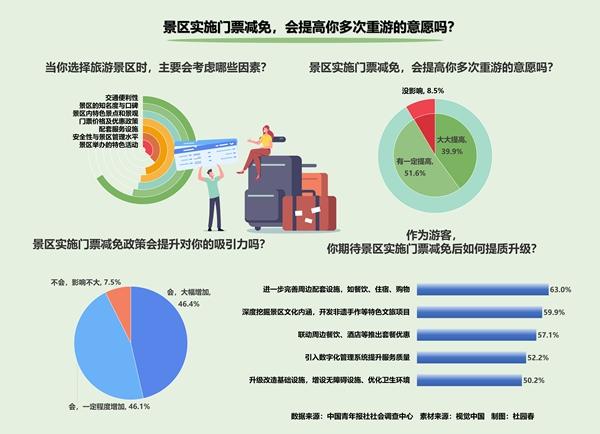 日前,中国青年报社社会调查中心联合问卷网(wenjuan.com),对1337名受访者进行的一项调查显示,景区门票减免,92.5%受访者表示会提升对自己的吸引力。景区提质升级,63.0%的受访者希望进一步完善周边配套设施,59.9%的受访者建议深度挖掘景区文化内涵,开发非遗手作等特色文旅项目。