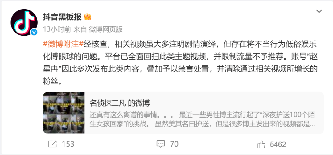 经核查,相关视频虽大多注明剧情演绎,但存在将不当行为低俗娱乐化博眼球的问题。平台已全面回扫此类主题视频,并限制流量不予推荐。账号“赵星冉”因为多次发布此类内容,叠加予以禁言处置,并清除通过相关视频所增长的粉丝。
