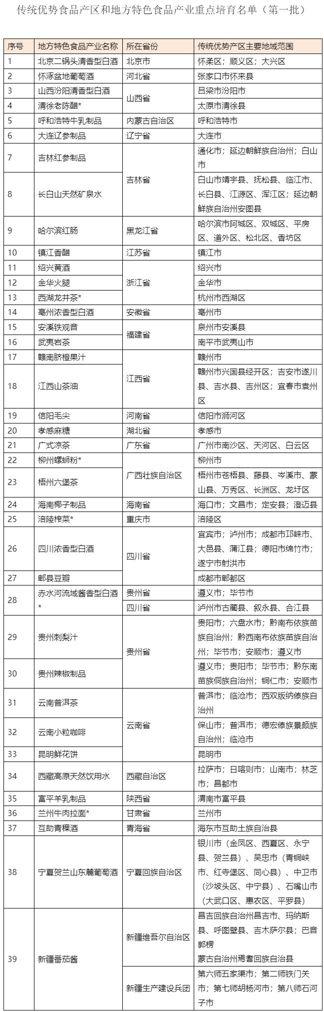 注:标*地方特色食品产业已纳入我部“首批中国消费名品名单”。