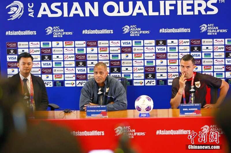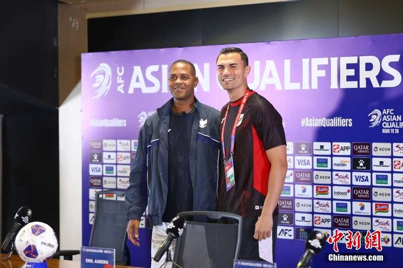 当地时间6月4日晚,印度尼西亚雅加达,印尼国家男子足球队举行赛前新闻发布会。中国队将在6月5日进行的2026年世界杯亚洲区预选赛18强赛第九轮比赛中客场对阵印度尼西亚队。图为印尼队主教练克鲁伊维特(中)与印尼队球员埃米尔·奥德罗(右)出席新闻发布会。