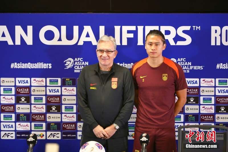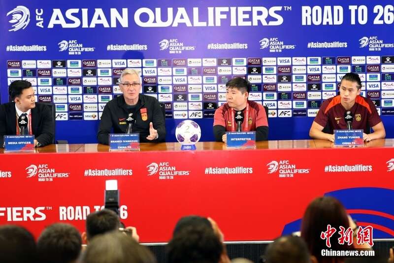 当地时间6月4日晚,印度尼西亚雅加达,中国国家男子足球队举行赛前新闻发布会并进行赛前训练。中国队将在6月5日进行的2026年世界杯亚洲区预选赛18强赛第九轮比赛中客场对阵印度尼西亚队。图为中国队主教练伊万科维奇(左二)和中国队球员张玉宁(右一)出席新闻发布会。