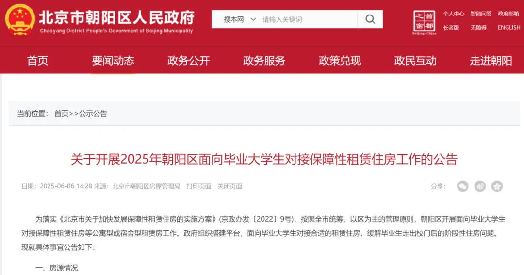 为缓解应届大学毕业生初入社会的住房压力,同时满足已在朝阳就业的大学生们的租房需求,6月6日,朝阳区房屋管理局发布公告,正式启动2025 年“青春无忧安居计划”,以“阶段化帮扶+多元化供给”为核心,推出了387套52间房源开展面向毕业大学生“应届求职1个月免费住——应届朝阳就业3个月免费住——往届朝阳就业专属优惠住”的阶段式安居工作,打造从校园到社会的“温暖过渡站”。