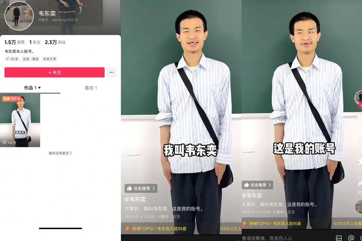 近日,在北京大学任教的韦东奕、网友熟悉的“韦神”发布视频和网友打招呼,其个人简介标注为“韦东奕本人账号”。截至6月7日下午4时许,韦东奕账号已获实名认证,粉丝已突破1600万,单条视频已经收获破千万点赞。