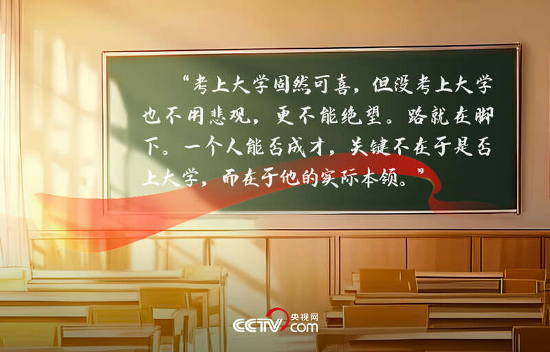 习近平在文中写道:“考上大学固然可喜,但没考上大学也不用悲观,更不能绝望。路就在脚下。一个人能否成才,关键不在于是否上大学,而在于他的实际本领。”