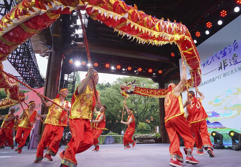 2025年6月13日,浙江温州鹿城区九山书会,民间艺人表演舞龙。