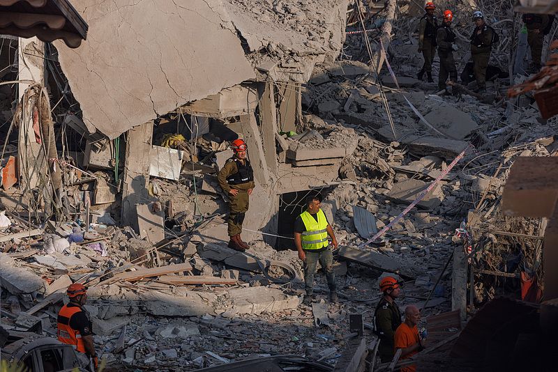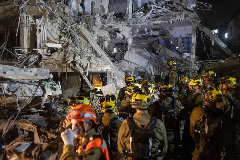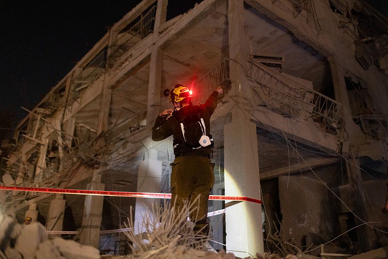 当地时间2025年6月13日,以色列拉马特甘,以色列救援人员在一栋被伊朗弹道导弹袭击受损的建筑物附近。伊朗在其核设施遭到前所未有的直接袭击后,向以色列发射了数百枚弹道导弹,加剧了这对宿敌之间的冲突,这可能使中东地区陷入战火并扰乱全球石油供应。