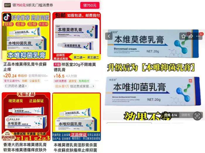 然而,多家直播电商平台所销售的“本唯抑菌乳膏”包装和“本维莫德乳膏”高度相似。商家将原药品包装上的商标替换成“某某堂”,并标注“新批次、新日期、新包装”,宣称产品从“本维莫徳乳膏”升级“本唯抑菌乳膏”,同时说明书内容将正品主要化学成分改为中药成分,并突出“治疗银屑牛皮癣”等疗效表述。