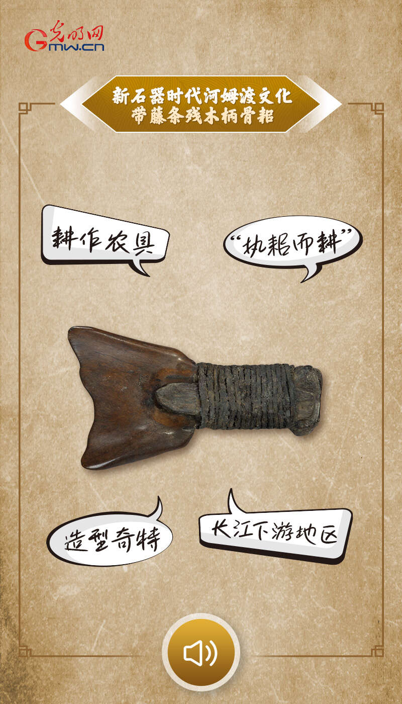 “一块被磨得锃亮的动物骨头,紧紧地绑着一圈圈藤条,藤条下残存着一块木棒……我是一件7000多年前的耕作农具,出土于浙江余姚河姆渡遗址。看见我,你一定会联想起长江下游地区先民们‘执耜而耕’的场景吧。”