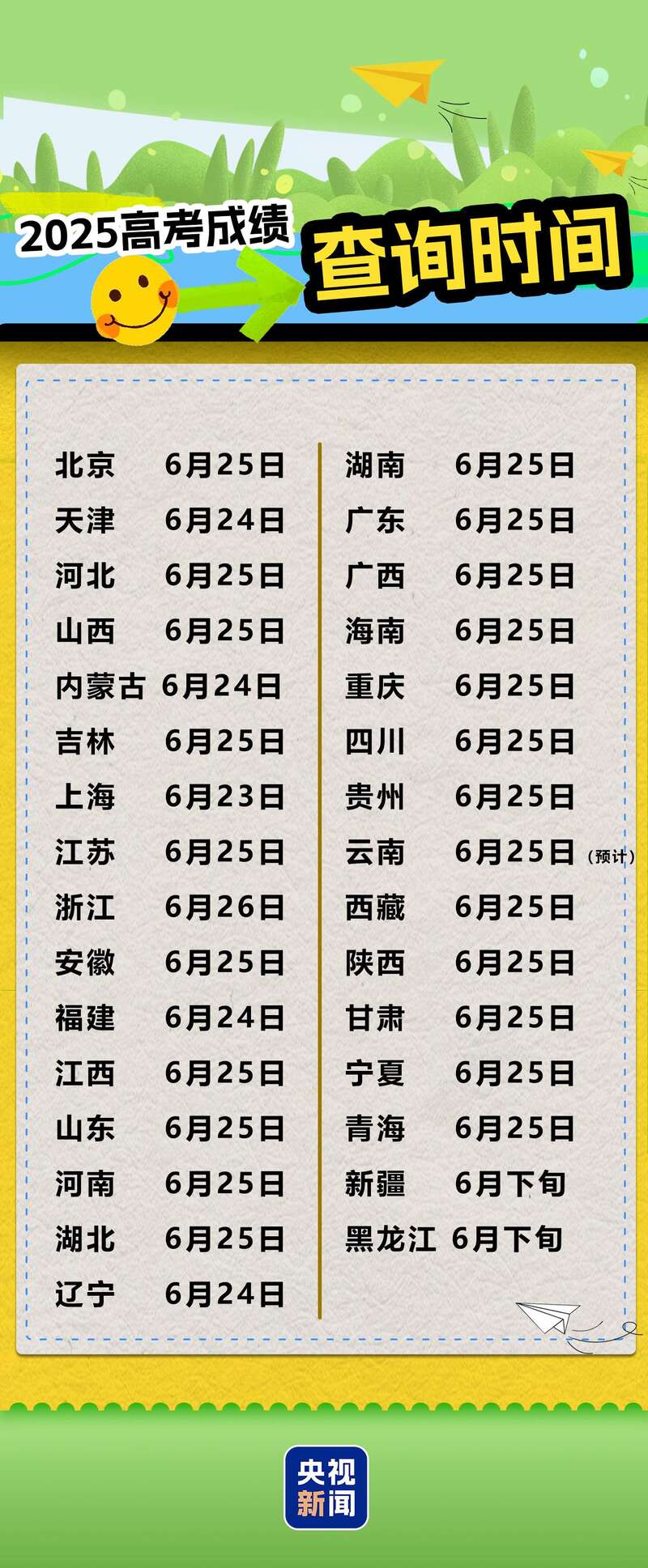 以下为各地公布的高考查分时间汇总↓↓↓更多具体信息请关注各地教育招生考试院官网。