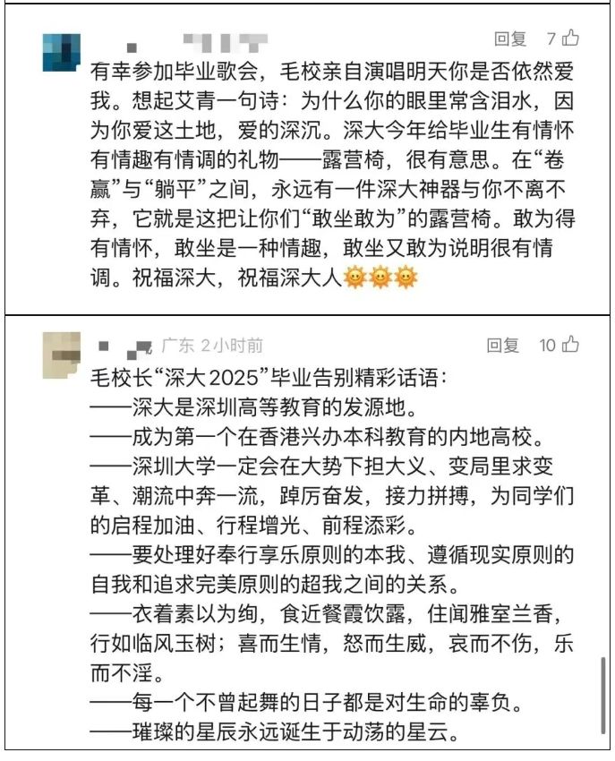 “同学们,母校希望你们有情怀,有情调,有情趣,能够给社会带来美好、给家人带来幸福、给朋友带来欢乐。基于此,学校今年为大家准备的毕业礼物是一把露营椅,风尘仆仆中的一席之地。你们大概又要偷笑这“既要又要”的老父亲心态,‘如何呢?又能怎?’本人代表学校不作辩解,就是既要你们在人生的旷野中奋力探索,又要你们在生活的别处张弛有度。在‘卷赢’与‘躺平’之间,永远有一件深大神器与你不离不弃,它就是这把让你们‘敢坐敢为’的露营椅。敢为得有情怀,敢坐是一种情趣,敢坐又敢为说明很有情调。”