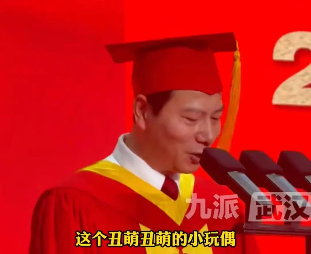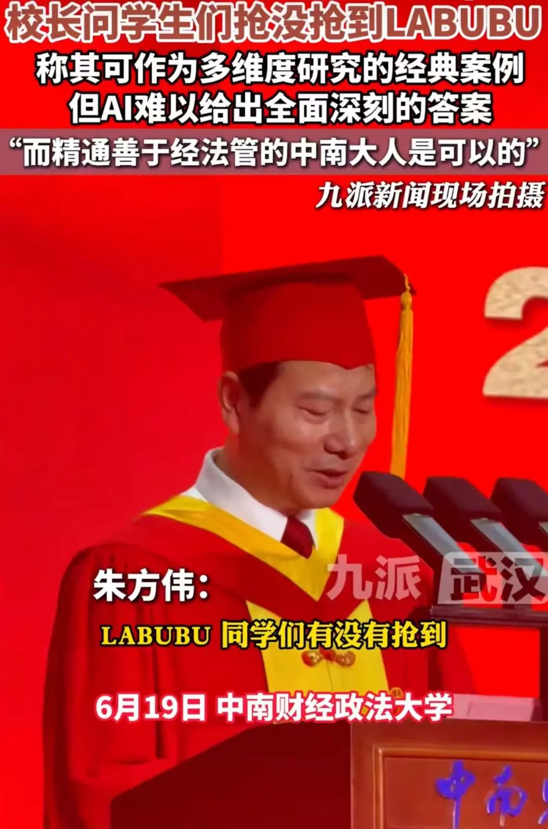 6月19日上午,2025年中南财经政法大学毕业典礼上,校长朱方伟同样借用Labubu爆火事件,发表了一段关于AI的论述。