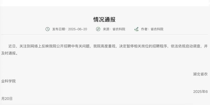 6月20日,湖北省农科院发布情况通报:“近日,关注到网络上反映我院公开招聘中有关问题,我院高度重视,决定暂停相关岗位的招聘程序,依法依规启动调查,并及时通报。”
