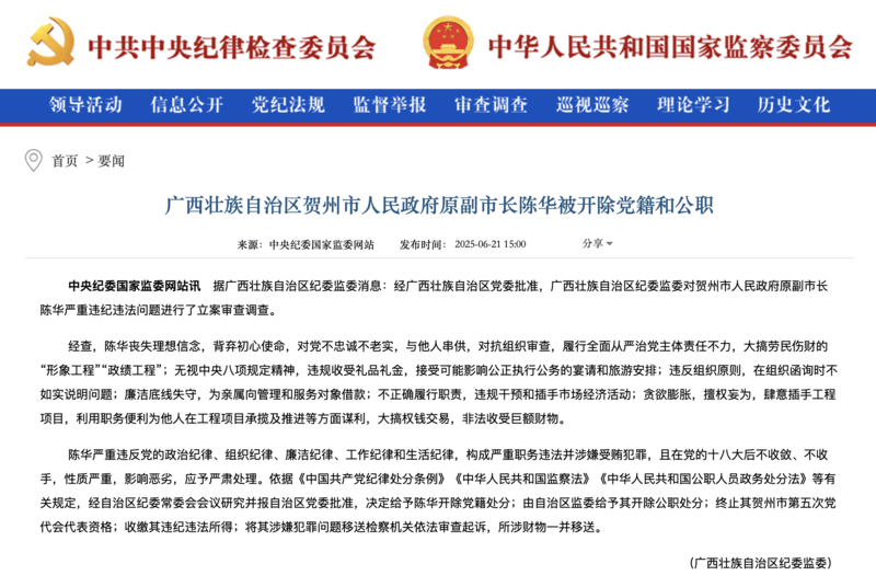 中央纪委国家监委网站6月21日通报,据广西壮族自治区纪委监委消息:经广西壮族自治区党委批准,广西壮族自治区纪委监委对贺州市人民政府原副市长陈华严重违纪违法问题进行了立案审查调查。