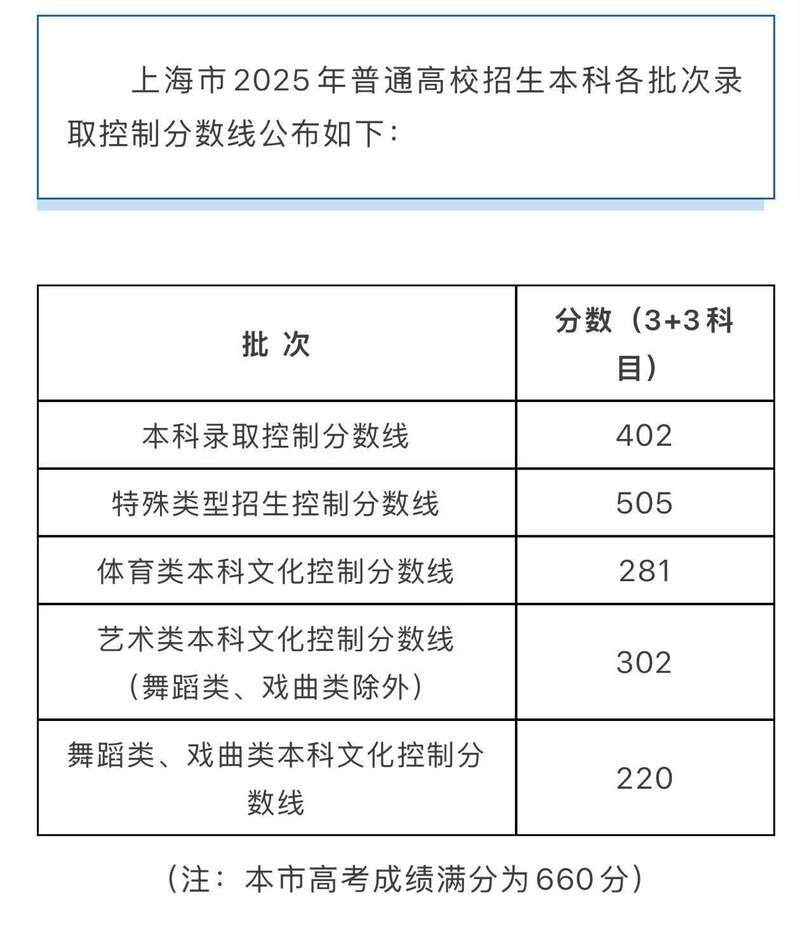 6月23日,上海市2025年普通高校招生本科各批次录取控制分数线公布。