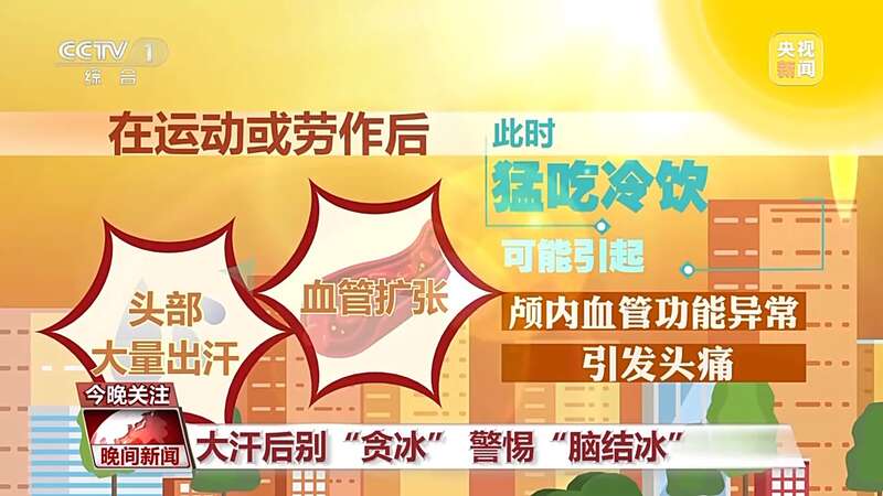 不少人喜欢在夏日里来一杯冰镇饮料或是大口吃冰激凌。对此,专家表示,在运动或劳作后,头部大量出汗、血管也会扩张,此时若猛吃冷饮,可能引起颅内血管功能异常,引发头痛。这种情况也被称为“脑结冰”,严重者会恶心、呕吐甚至造成短时间的血压升高等症状。建议大家在出汗后2小时再食用冷饮。