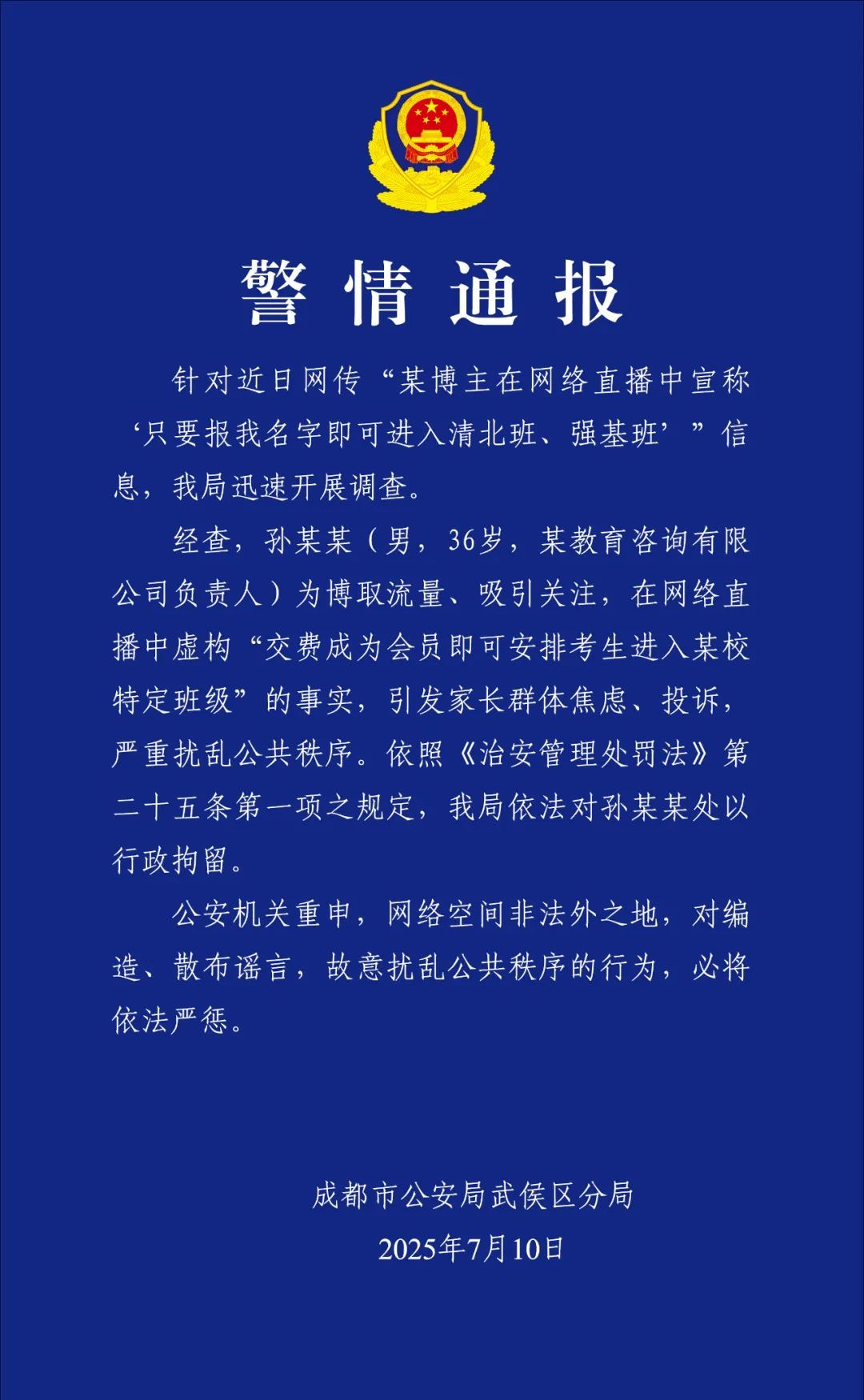 针对近日网传“某博主在网络直播中宣称‘只要报我名字即可进入清北班、强基班’”信息,公安局迅速开展调查。